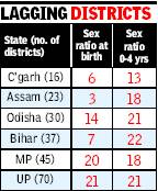 States that started off with high sex ratio in both categories,such as Chhattisgarh and Assam, have recorded the biggest declines in 0-4 category along with Bihar and Odisha.