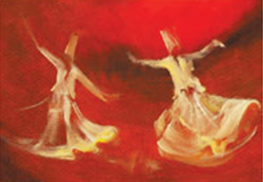 As one beholds the whirling dervaish in Shafique’s paintings, one is struck by the emotional aspect that these paintings elicit. The play of colour and form leaves us with a feeling of divine mystery and a serene harmony. Shafique has learned and taught colour psychology and knows exactly how the different colours affect subjectivity and feelings.