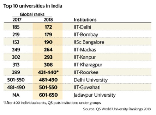 The two other Indian institutions in Quacquarelli Symonds World University Rankings 2018 are IIT Bombay and Indian Institute of Science, Bangalore