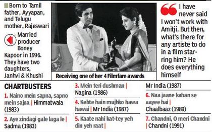 With films like Himmatwala, Tohfa, Mr India, Chandni, Nagina, Sadma; Sridevi emerged as the top star in the country.