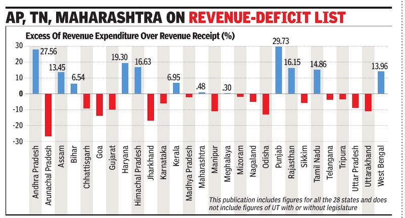 The report, released on Friday by CAG Sanjay Murthy, found that in 2022-23, at least 12 states were in revenue deficit. These included Andhra Pradesh (-Rs 43,488 crore), Tamil Nadu (-Rs 36,215 crore), Rajasthan (-Rs 31,491 crore), West Bengal (-Rs 27,295 crore), Punjab (-Rs 26,045 crore), Haryana (-Rs 17,212 crore), Assam (-Rs 12,072 crore), Bihar (-Rs 11,288 crore), Himachal Pradesh (-Rs 6,336 crore), Kerala (-Rs 9,226 crore), Maharashtra (-Rs 1,936 crore) and Meghalaya (-Rs 44 crore).