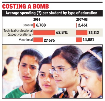 In 2007-08, the spending on technical courses and vocational education was 13 times and six times more as compared to general education.The survey found that the spending on technical education in private aided and unaided institutions varied between 1.5-2.5 times of that in government institutions.