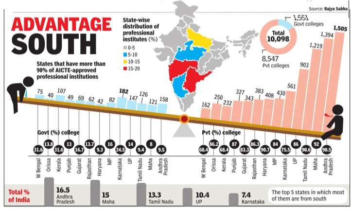 The demand for skilled workforce is growing in tandem with India's economic growth. But governmentgovt-aided professional institutes have not kept pace with the increasing demand for professional training. This gap is filled by private institutes that constitute 85% of AICTE-approved professional institutes in India. A little over 40% of such institutes are located in the four southern states. If we add Uttar Pradesh and Maharashtra, then these six states are home to about 66% of AICTE-approved professional institutes