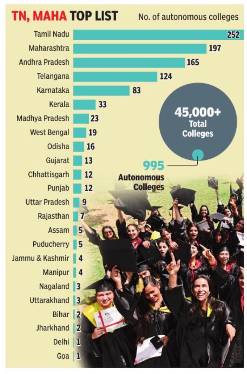 As per UGC regulations on “graded autonomy”, five central universities, 21 state universities and 26 private universities have been given this status. Eight colleges have also been given autonomous status under the autonomous colleges regulation.