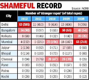 While data for Delhi have been stable over the previous years, large swings between years for a few other cities raise some doubts over the accuracy of NCRB data. Bangalore is the most extreme example of this: the proportion of ‘stranger rapes’ in the southern city swung from 77% to 0% between two consecutive years, 2009 and 2010. Karnataka’s crime statistics chief hadearlier toldTOIthat it was probably a problem with the numbers. “In Bangalore and Karnataka, as in the rest of the country, rape by strangers is a very small part of total rapes,’ Praveen Sood, additional DGP, Karnataka State Crime Records Bureau, had told TOI. A spokesperson for the Delhi police said he could not comment without the exact numbers in front of him.