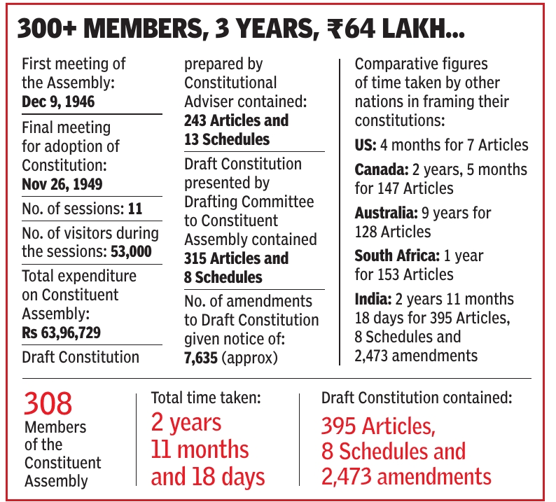 It took two years, 11 months and 17 days to compile the world's longest national statute. The constituent assembly held 11 sessions over 165 days. On August 29, 1947, it set up a drafting committee under Ambedkar.The constitution was adopted on November 26, 1949. It came into force on January 26, 1950. That day the assembly became the provisional Parliament of India. This date was chosen to honour the “purna swaraj“ declaration of 1930.